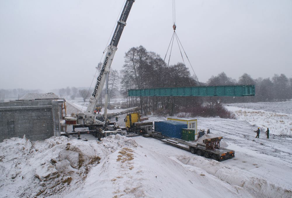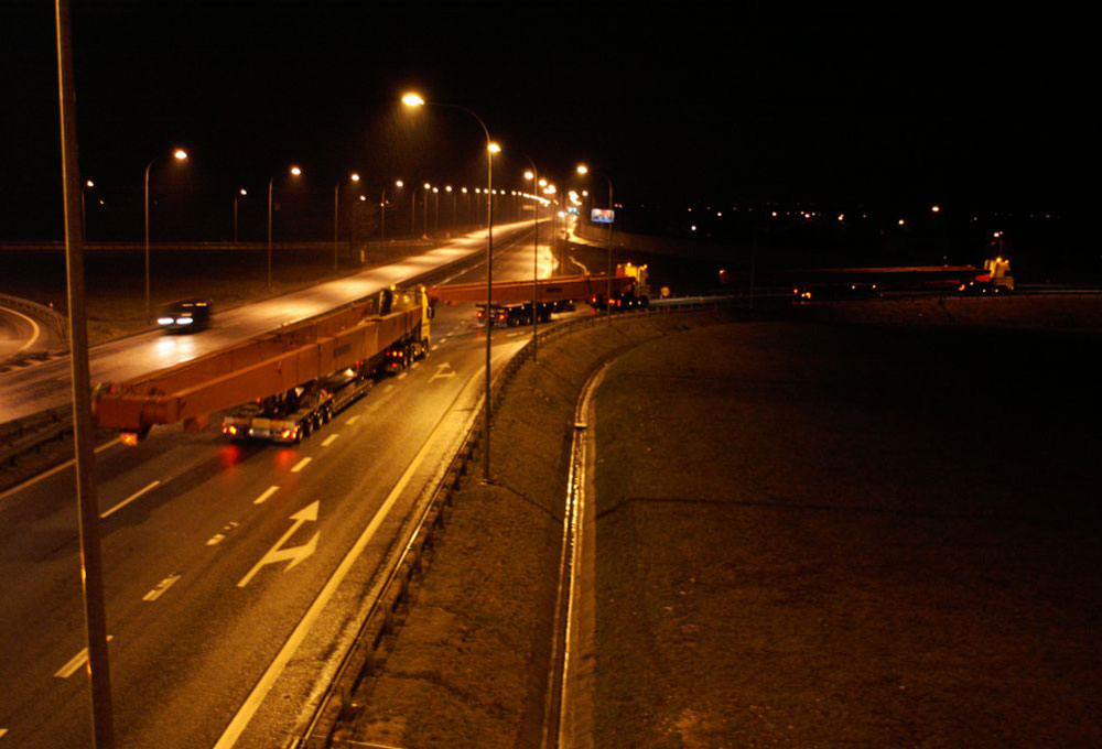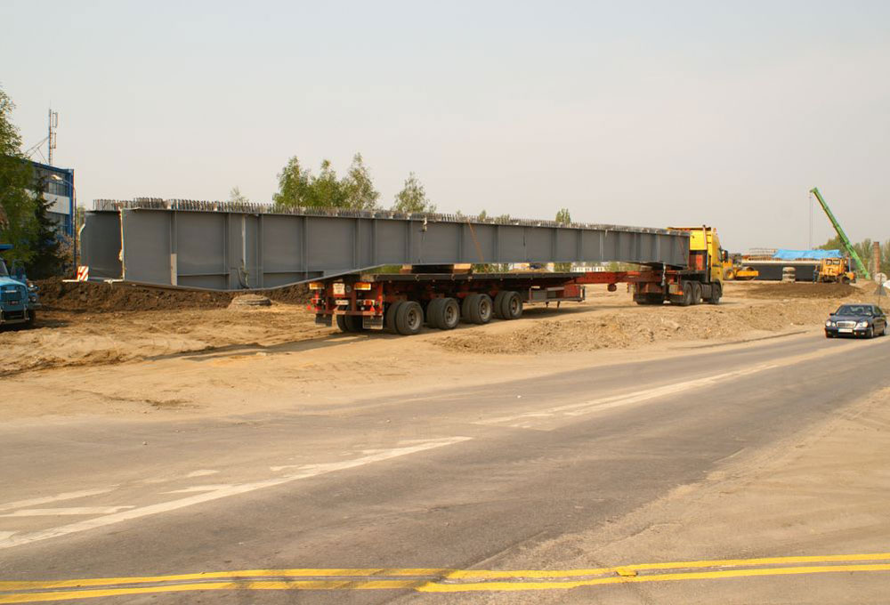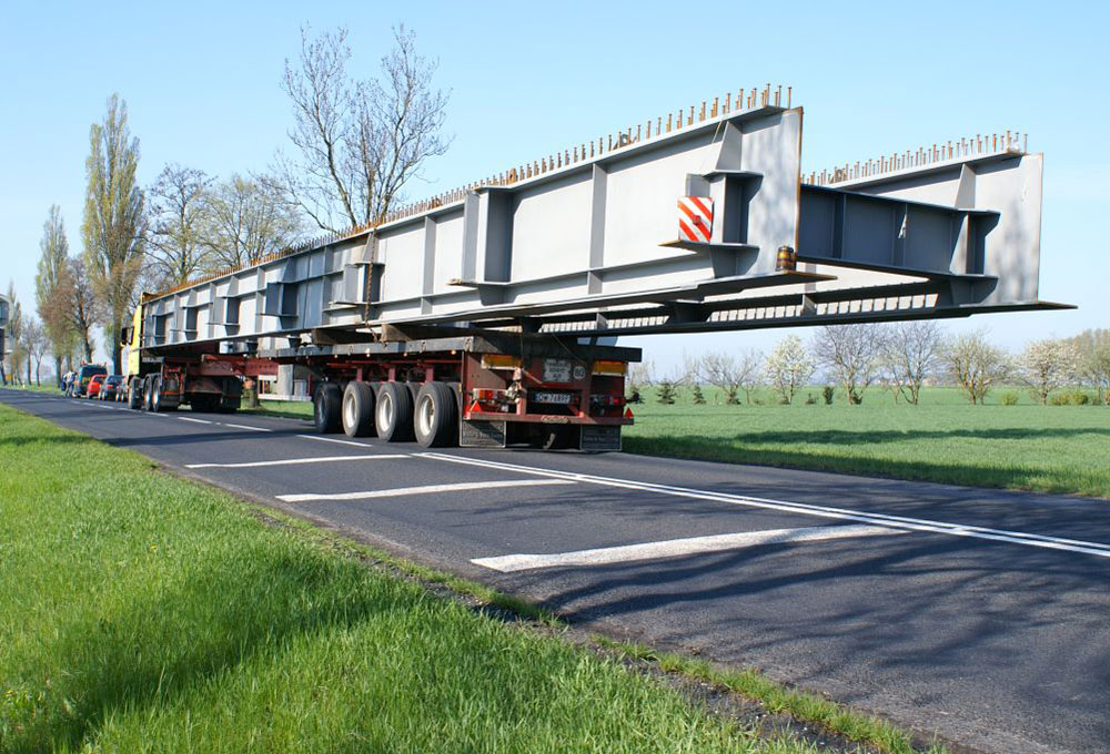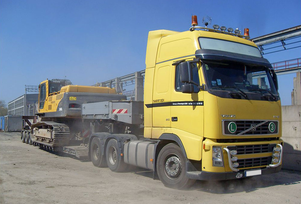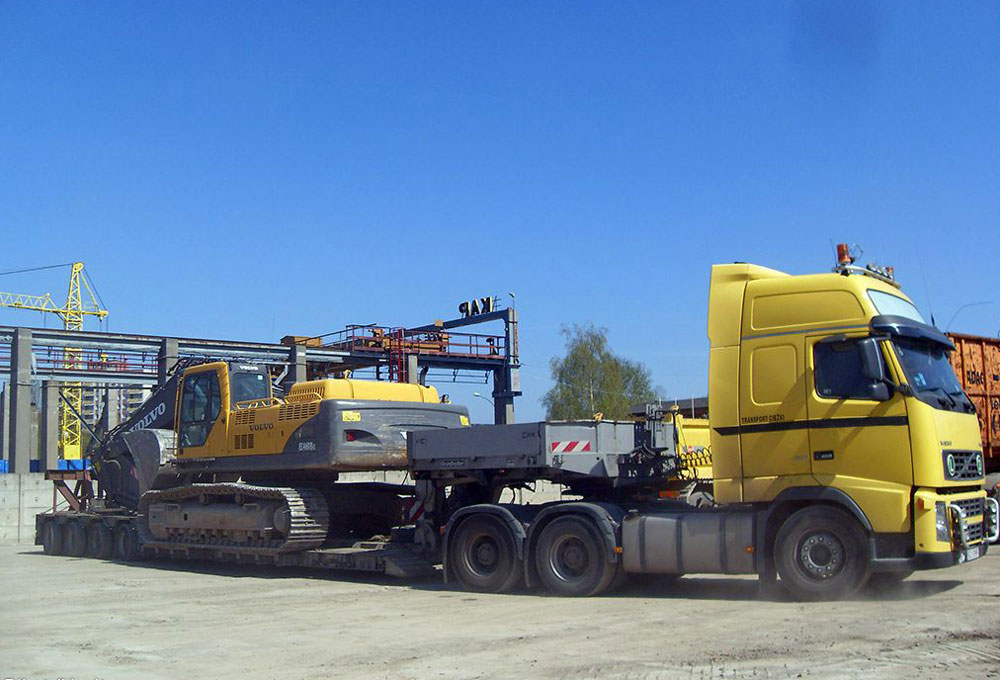 Posiadamy naczepy z pomostem zagłębianym Tiefbett, pozwalającym na przewóz ładunków o ciężarze do 80 ton – wysokość ładunkowa przewożonych maszyn 40cm nad powierzchnią ziemi.